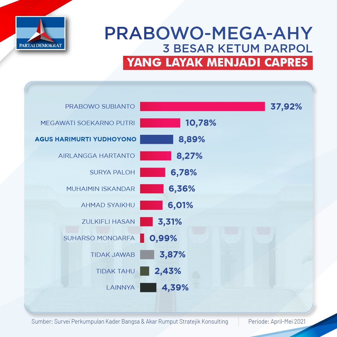 “Hasil ini konsisten dengan tiga survei sebelumnya oleh Indikator Politik, Balitbang Kompas dan LP3ES,” tegas Tomi Satryatomo, Kabalitbang DPP Partai Demokrat,