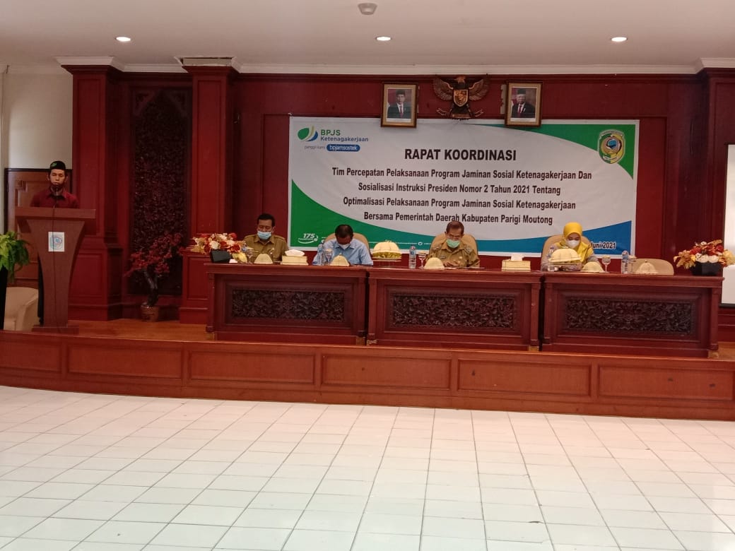 PARIGI MOUTONG, Celebespos.com – Wakil Bupati Parigi Moutong, Badrun Nggai pimpin Rapat Koordinasi (Rakor) tim percepatan pelaksanaan program jaminan sosial ketenagakerjaan dan sosialisasi program jaminan sosial ketenagakerjaan sesuai Intruksi Presiden Nomor 2 Tahun 2021 tentang optimalisasi pelaksanaan program jaminan sosial ketenagakerjaan, bertempat di lantai II Kantor Bupati Parimo, Selasa (8/6/2021) siang.