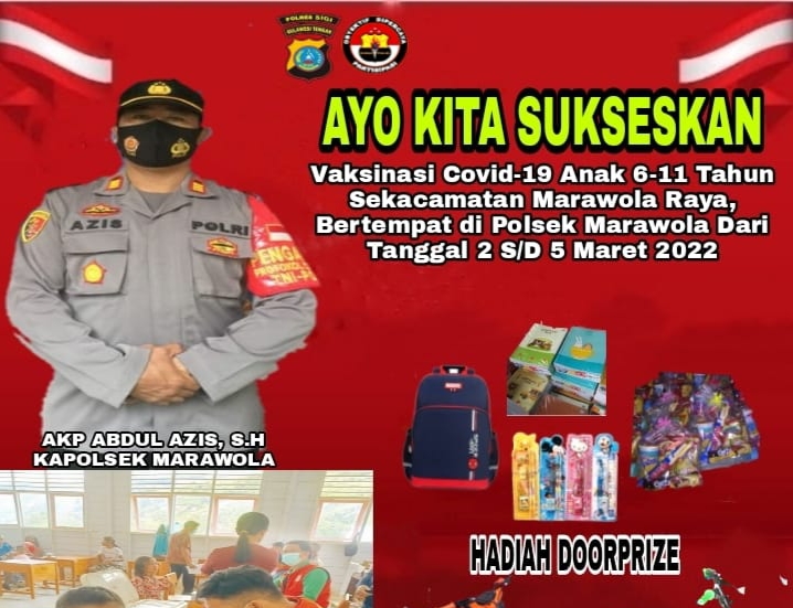 Meski belum mencapai target 70 persen, Kapolsek Marawola AKP. Abdul Azis, SH menyampaikan giat pelaksanaan vaksinasi anak usia 6 – 11 tahun akan terus di gencarkan diwilayah Marawola Raya guna penanganan virus covid-19 pada anak dan juga sesuai arahan Kapolri Jendral Listyo Sigit Prabowo.