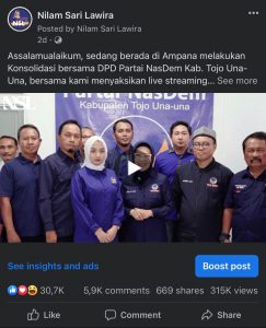 “Saya, Nilam Sari Lawira, Ketua DPW Partai NasDem Provinsi Sulawesi Tengah mengucapkan selamat kepada bapak Anies Baswedan, yang telah ditetapkan secara resmi oleh bapak Surya Paloh sebagai calon Presiden dari Partai NasDem 2024. Kami sebagai kader NasDem Sulawesi Tengah, akan berjuang sungguh-sungguh untuk memenangkan Anies Baswedan di Pilpres 2024. NasDem Partaiku, Anies Baswedan Presidenku. Bersatu ! Berjuang ! Menang..“ ucap Nilam Sari Lawira di dampingi kader NasDem lainnya melalui akun FB pribadinya.