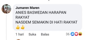 Salah satunya diungkapkan pemilik akun Jumaren Maren “ANIES BASWEDAN HARAPAN RAKYAT, NASDEM SEMAKIN DI HATI RAKYAT” tulisnya. (Kar)