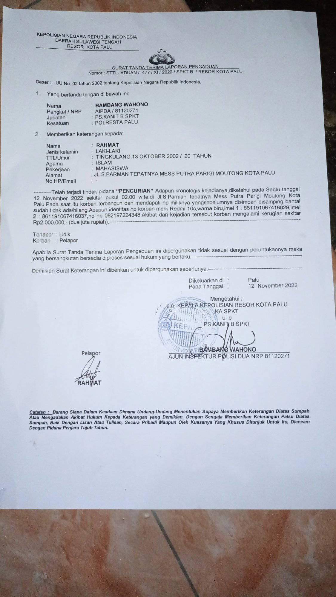 Tindak pencurian tersebut telah dilaporkan ke kepolisian setempat yang termuat dalam STTLP bernomor : STTL – ADUAN/447/XI/2022/SPKT B/Resort Kota Palu.