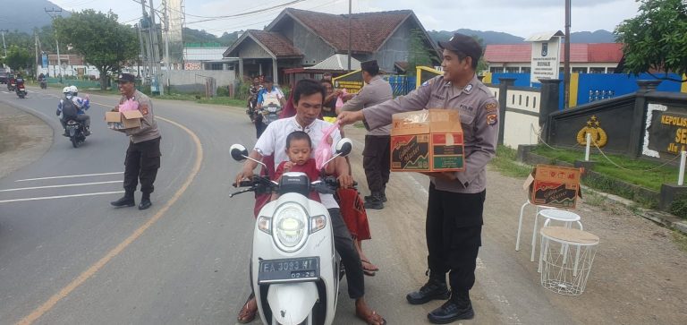 Polisi Bagikan Takjil kepada Pengendara yang Melintas di Depan Mapolsek Seteluk