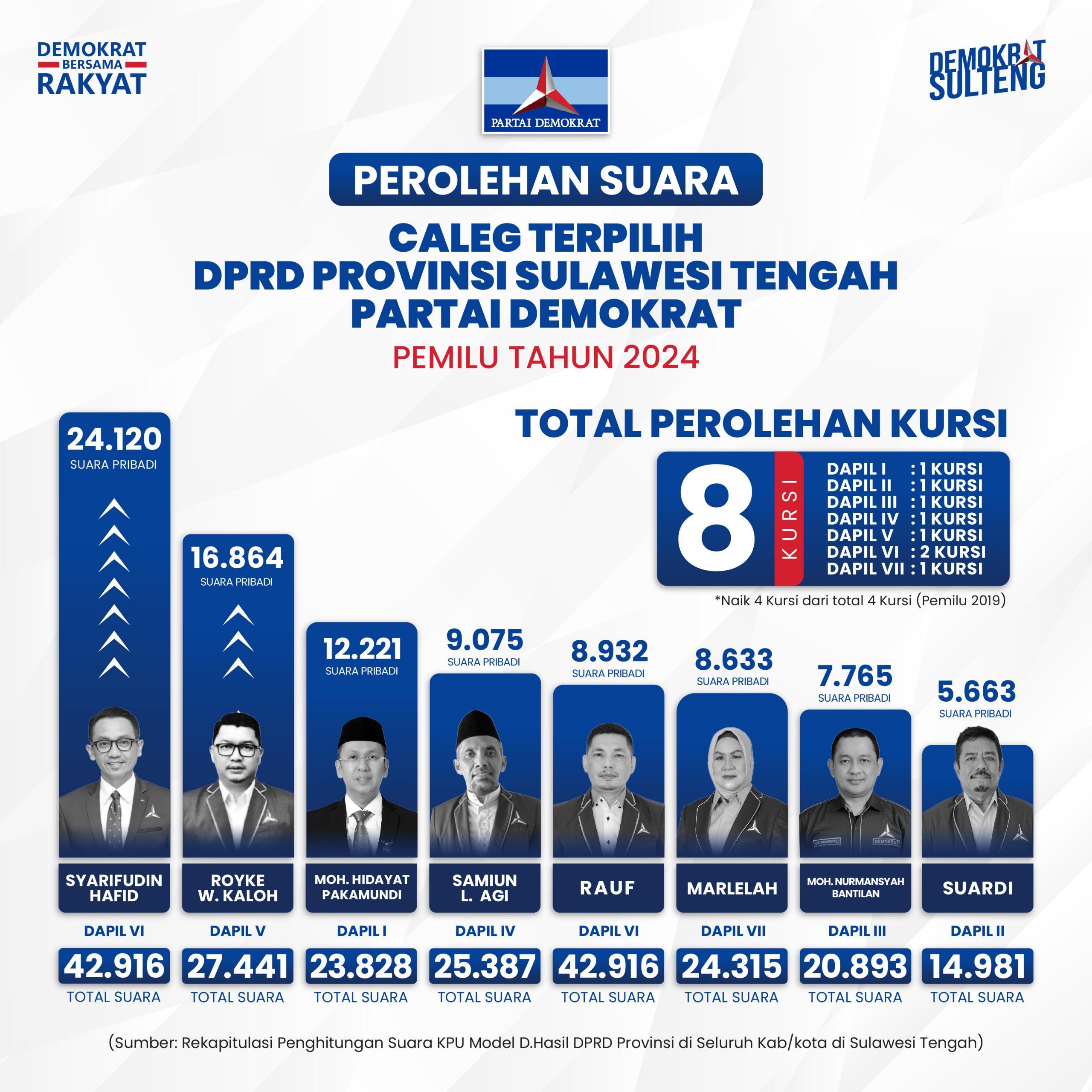 Alhasil Pileg 2024 Partai Demokrat meraih 8 kursi, Yakni ; Dapil I Kota Palu ( Hidayat Pakamundi), Dapil II ( Suardi) Dapil III (Moh Nurmansyah Bantilan), Dapil IV ( Samiun L.Agi), Dapil V ( Royke Wakoleh) Dapil VI ( Syarifuddin Hafid dan Rauf) dan Dapil VII ( Marlelah).
